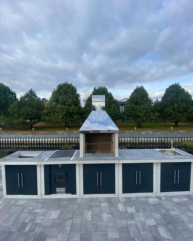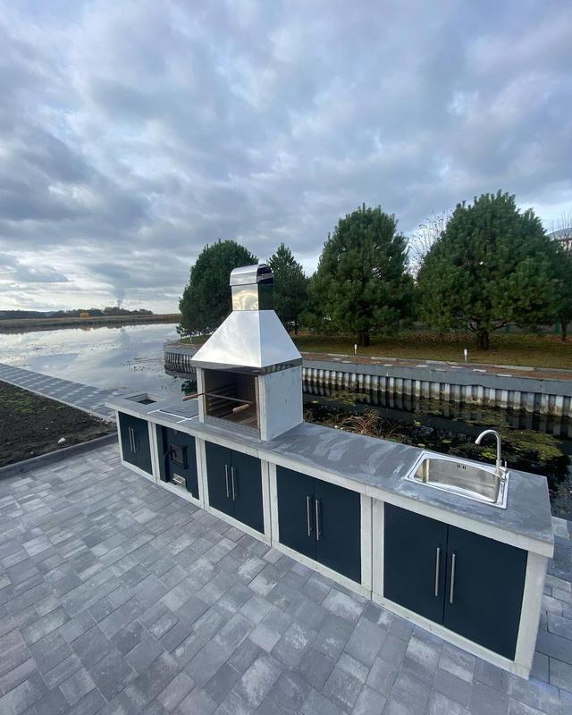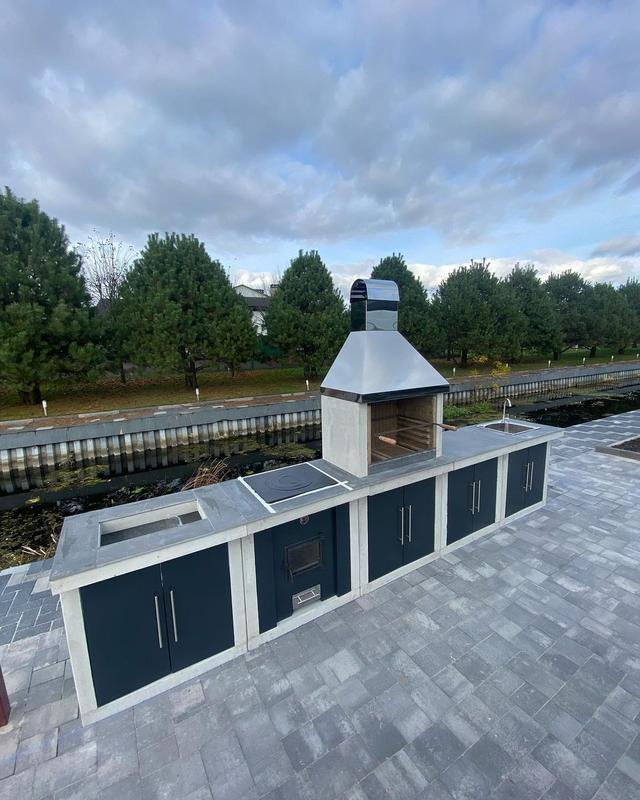 Камін-барбекю в комплекті зі столом і мийкою, дасть змогу легко приготувати м'ясо. Бетонний стіл і стіл мийка, дасть змогу практично нарізати та помити для приготування.