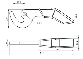 Ручка-гачок - зручний важіль для відкриття і закривання дверцят твердопаливного котла, бункера або опалювальної печі. При закритті дверей гачок входить в зачеплення з відповідною частиною (упором), при повороті ручки двері щільно притискається, забезпечуючи герметичність закриття. Ручка надійно фіксує дверцята, чим забезпечує ізоляцію камери згоряння від надходження повітря зовні і запобігає попадання продуктів згорання в приміщення. Призначена для використання як у закритих приміщеннях, так і зовні при температурі від -20 до 200°С Рукоятка виготовляється з термостійкої пластмаси, завдяки чому витримує високий температурний вплив. Ручка виконана з оцинкованої сталі.