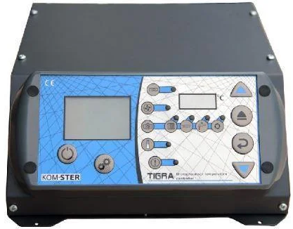 Автоматика ТИГРА - це контролер який забезпечує підтримку заданої температури теплоносія в котлі, який обладнаний автоматичною подачею палива - шнек. Завдяки розширеним можливостям він гарантує економічну і автоматичну роботу котла, а також повний контроль насосів ц.про., р. в. з (гарячого водопостачання), насоса статевого опалення та циркуляційного насоса. Функції часового поясу, ефективності витрат, режиму дня і ночі, а також новий алгоритм керування вентилятора дозволяє заощадити до 20% палива в порівнянні з традиційними регуляторами. Висновок для термостата забезпечує зручність і комфорт при використанні кімнатного регулятора. Цей регулятор виділяється з інших моделей на ринку тим, що до нього можна підключити додаткові пульти дистанційного управління (можливість контролювати котел в будь-якого місці приміщення).